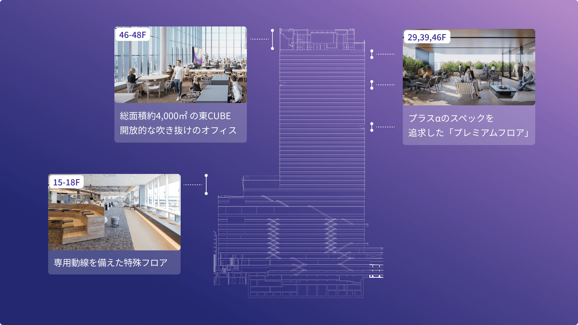 総面積約2,600㎡・天井高約2,900mmの広々とした無柱空間が広がるハイスペックな基準階フロア。豊かな自然光と美しい眺望に恵まれた自由度の高い空間です。